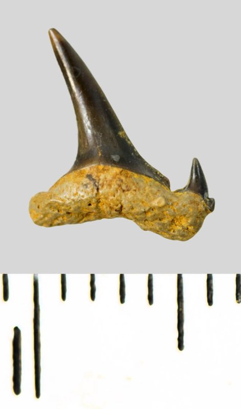 Мелкий боковой зуб с коронкой серого цвета, колюще-режущего типа, S-образно изогнутой, с гладким режущим краем. С лингвальной стороны у основания коронки на эмали имеется скульптура в виде слабой продольной струйчатости. Корень охристый, арочный, умеренно массивный, со следами окатанности. Имеется одна питательная борозда с лингвальной стороны корня. Имелась одна пара добавочных зубцов коронки, сохранился только правый.