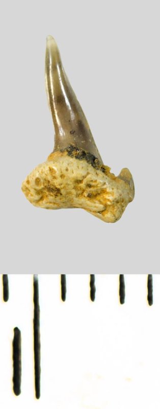 Мелкий боковой зуб с коронкой серого цвета, колюще-режущего типа, S-образно изогнутой, с гладким режущим краем. С лингвальной стороны у основания коронки на эмали имеется скульптура в виде слабой продольной струйчатости. Корень охристый, арочный, умеренно массивный, со следами окатанности. Имеется одна питательная борозда с лингвальной стороны корня. Имелась одна пара добавочных зубцов коронки, сохранился только правый.