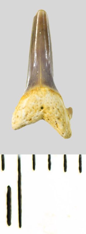 Мелкий боковой зуб с коронкой серого цвета, колюще-режущего типа, S-образно изогнутой, с гладким режущим краем. С лингвальной стороны у основания коронки на эмали имеется скульптура в виде слабой продольной струйчатости. Корень охристый, арочный, умеренно массивный, со следами окатанности. Имеется одна питательная борозда с лингвальной стороны корня. Имелась одна пара добавочных зубцов коронки, сохранился только правый.