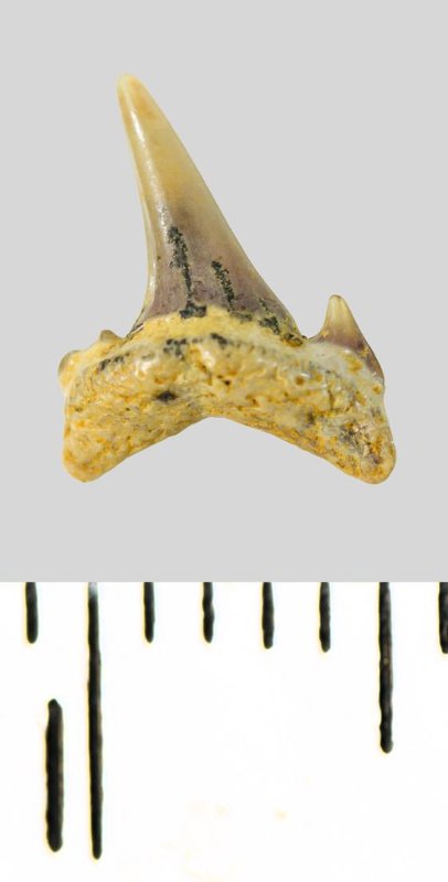 Мелкий боковой зуб с коронкой серого цвета, колюще-режущего типа, S-образно изогнутой, с гладким режущим краем. С лингвальной стороны у основания коронки на эмали имеется скульптура в виде слабой продольной струйчатости. Корень охристый, арочный, умеренно массивный, со следами окатанности. Имеется одна питательная борозда с лингвальной стороны корня. Имелась одна пара добавочных зубцов коронки, сохранился только правый.