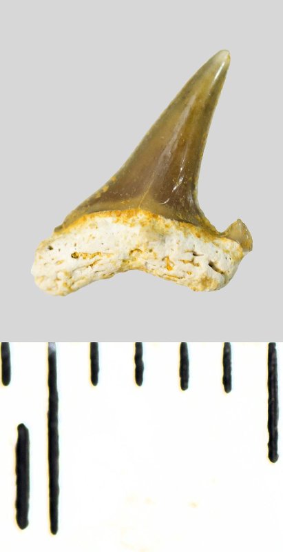 Мелкий боковой зуб с коронкой серого цвета, колюще-режущего типа, S-образно изогнутой, с гладким режущим краем. С лингвальной стороны у основания коронки на эмали имеется скульптура в виде слабой продольной струйчатости. Корень охристый, арочный, умеренно массивный, со следами окатанности. Имеется одна питательная борозда с лингвальной стороны корня. Имелась одна пара добавочных зубцов коронки, сохранился только правый.