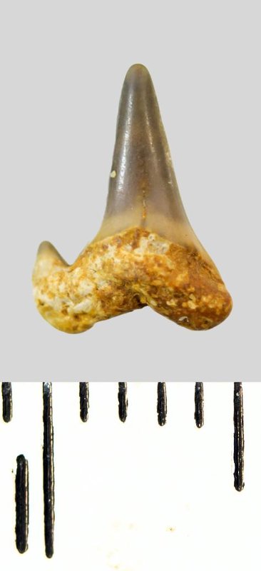Мелкий боковой зуб с коронкой серого цвета, колюще-режущего типа, S-образно изогнутой, с гладким режущим краем. С лингвальной стороны у основания коронки на эмали имеется скульптура в виде слабой продольной струйчатости. Корень охристый, арочный, умеренно массивный, со следами окатанности. С лингвальной стороны корня одна питательная борозда. Имелась одна пара добавочных зубцов коронки, сохранился только левый.