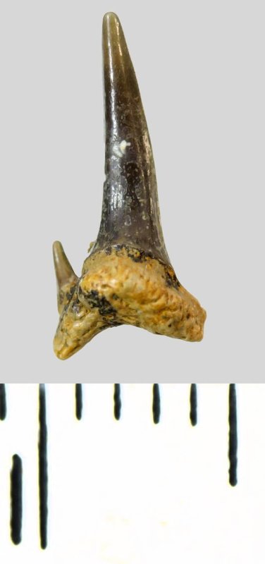 Мелкий боковой зуб с коронкой серого цвета, колюще-режущего типа, S-образно изогнутой, с гладким режущим краем. С лингвальной стороны у основания коронки на эмали имеется скульптура в виде слабой продольной струйчатости. Корень охристый, арочный, умеренно массивный, со следами окатанности. С лингвальной стороны корня одна питательная борозда. Имелась одна пара добавочных зубцов коронки, сохранился только левый.