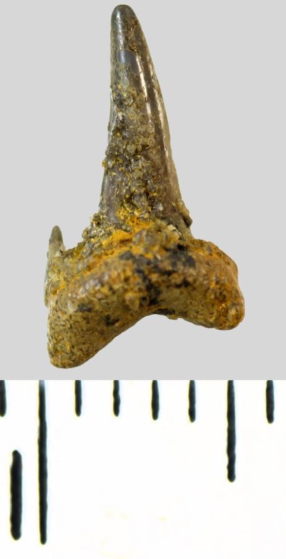 Мелкий боковой зуб с коронкой серого цвета, колюще-режущего типа, S-образно изогнутой, с гладким режущим краем. С лингвальной стороны у основания коронки на эмали имеется скульптура в виде слабой продольной струйчатости. Корень охристый, арочный, умеренно массивный, со следами окатанности. С лингвальной стороны корня одна питательная борозда. Имелась одна пара добавочных зубцов коронки, сохранился только левый.