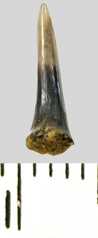 Зуб (фрагмент). Акула. Eostriatolamia subulata (Agassiz, 1843). Классификация: Хордовые Chordata, Позвоночные Vertebrata, Хрящевые рыбы Chondrichthyes, Пластиножаберные Elasmobranchii, Акулы Selachii, Ламнообразные Lamniformes, Песчаные акулы Odontaspididae