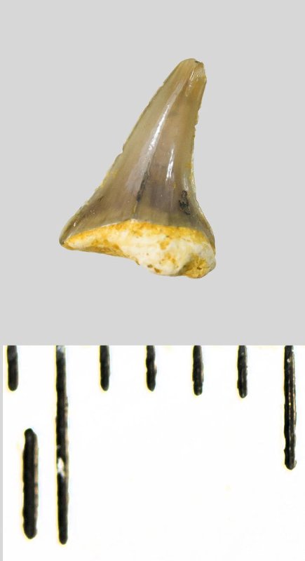 Зуб (фрагмент). Акула. Eostriatolamia subulata (Agassiz, 1843). Классификация: Хордовые Chordata, Позвоночные Vertebrata, Хрящевые рыбы Chondrichthyes, Пластиножаберные Elasmobranchii, Акулы Selachii, Ламнообразные Lamniformes, Песчаные акулы Odontaspididae