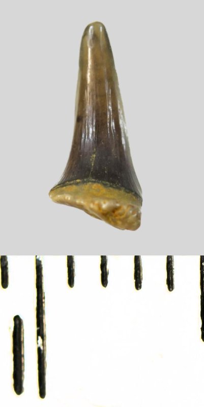 Зуб (фрагмент). Акула. Eostriatolamia subulata (Agassiz, 1843). Классификация: Хордовые Chordata, Позвоночные Vertebrata, Хрящевые рыбы Chondrichthyes, Пластиножаберные Elasmobranchii, Акулы Selachii, Ламнообразные Lamniformes, Песчаные акулы Odontaspididae