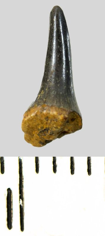 Зуб (фрагмент). Акула. Eostriatolamia subulata (Agassiz, 1843). Классификация: Хордовые Chordata, Позвоночные Vertebrata, Хрящевые рыбы Chondrichthyes, Пластиножаберные Elasmobranchii, Акулы Selachii, Ламнообразные Lamniformes, Песчаные акулы Odontaspididae