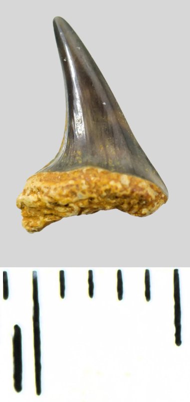 Зуб (фрагмент). Акула. Eostriatolamia subulata (Agassiz, 1843). Классификация: Хордовые Chordata, Позвоночные Vertebrata, Хрящевые рыбы Chondrichthyes, Пластиножаберные Elasmobranchii, Акулы Selachii, Ламнообразные Lamniformes, Песчаные акулы Odontaspididae