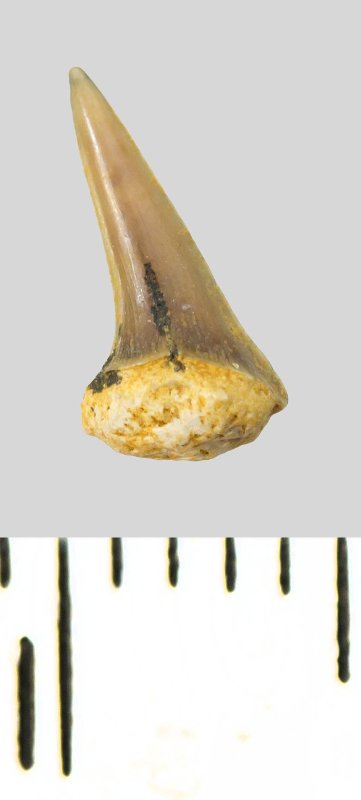 Зуб (фрагмент). Акула. Eostriatolamia subulata (Agassiz, 1843). Классификация: Хордовые Chordata, Позвоночные Vertebrata, Хрящевые рыбы Chondrichthyes, Пластиножаберные Elasmobranchii, Акулы Selachii, Ламнообразные Lamniformes, Песчаные акулы Odontaspididae