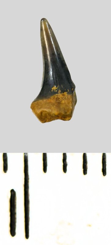 Зуб (фрагмент). Акула. Eostriatolamia subulata (Agassiz, 1843). Классификация: Хордовые Chordata, Позвоночные Vertebrata, Хрящевые рыбы Chondrichthyes, Пластиножаберные Elasmobranchii, Акулы Selachii, Ламнообразные Lamniformes, Песчаные акулы Odontaspididae