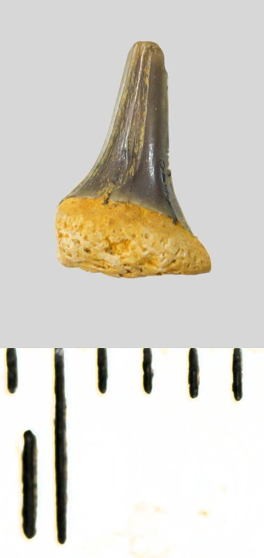 Зуб (фрагмент). Акула. Eostriatolamia subulata (Agassiz, 1843). Классификация: Хордовые Chordata, Позвоночные Vertebrata, Хрящевые рыбы Chondrichthyes, Пластиножаберные Elasmobranchii, Акулы Selachii, Ламнообразные Lamniformes, Песчаные акулы Odontaspididae
