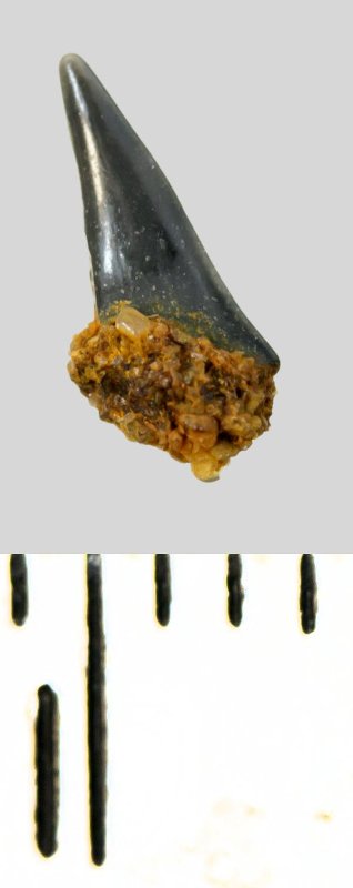 Зуб (фрагмент). Акула. Eostriatolamia subulata (Agassiz, 1843). Классификация: Хордовые Chordata, Позвоночные Vertebrata, Хрящевые рыбы Chondrichthyes, Пластиножаберные Elasmobranchii, Акулы Selachii, Ламнообразные Lamniformes, Песчаные акулы Odontaspididae
