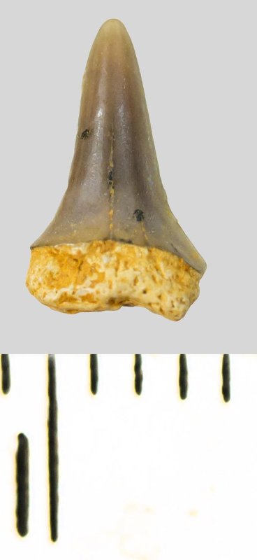 Зуб (фрагмент). Акула. Eostriatolamia subulata (Agassiz, 1843). Классификация: Хордовые Chordata, Позвоночные Vertebrata, Хрящевые рыбы Chondrichthyes, Пластиножаберные Elasmobranchii, Акулы Selachii, Ламнообразные Lamniformes, Песчаные акулы Odontaspididae