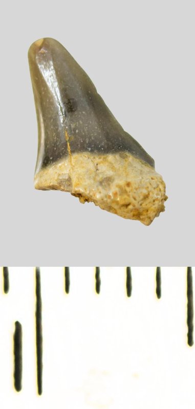 Коронка мелкого бокового зуба серого цвета, колюще-режущего типа, S-образно изогнутая, с гладким режущим краем. С лингвальной стороны у основания коронки на эмали имеется скульптура в виде слабой продольной струйчатости. Корень охристый, сохранился фрагментарно