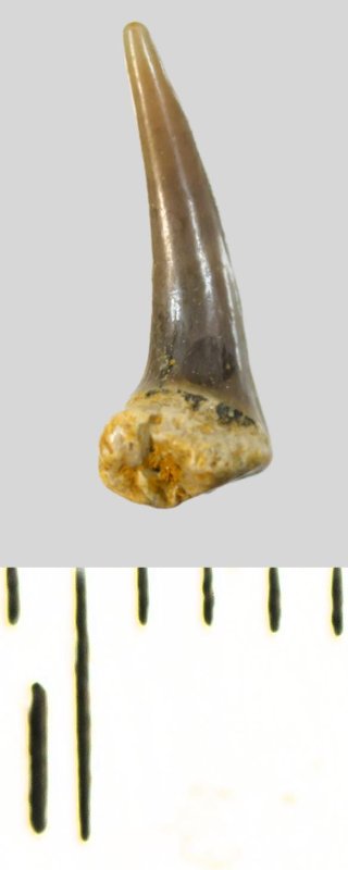 Коронка мелкого бокового зуба серого цвета, колюще-режущего типа, S-образно изогнутая, с гладким режущим краем. С лингвальной стороны у основания коронки на эмали имеется скульптура в виде слабой продольной струйчатости. Корень охристый, сохранился фрагментарно
