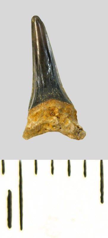 Зуб (фрагмент). Акула. Eostriatolamia subulata (Agassiz, 1843). Классификация: Хордовые Chordata, Позвоночные Vertebrata, Хрящевые рыбы Chondrichthyes, Пластиножаберные Elasmobranchii, Акулы Selachii, Ламнообразные Lamniformes, Песчаные акулы Odontaspididae