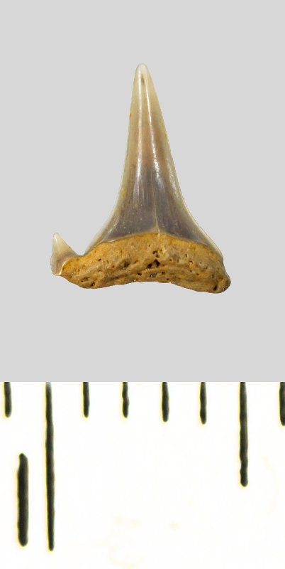 Зуб (фрагмент). Акула. Eostriatolamia subulata (Agassiz, 1843). Классификация: Хордовые Chordata, Позвоночные Vertebrata, Хрящевые рыбы Chondrichthyes, Пластиножаберные Elasmobranchii, Акулы Selachii, Ламнообразные Lamniformes, Песчаные акулы Odontaspididae