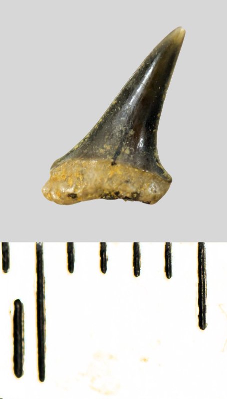 Зуб (фрагмент). Акула. Eostriatolamia subulata (Agassiz, 1843). Классификация: Хордовые Chordata, Позвоночные Vertebrata, Хрящевые рыбы Chondrichthyes, Пластиножаберные Elasmobranchii, Акулы Selachii, Ламнообразные Lamniformes, Песчаные акулы Odontaspididae