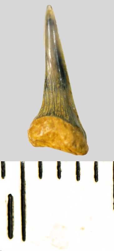 Зуб (фрагмент). Акула. Eostriatolamia subulata (Agassiz, 1843). Классификация: Хордовые Chordata, Позвоночные Vertebrata, Хрящевые рыбы Chondrichthyes, Пластиножаберные Elasmobranchii, Акулы Selachii, Ламнообразные Lamniformes, Песчаные акулы Odontaspididae