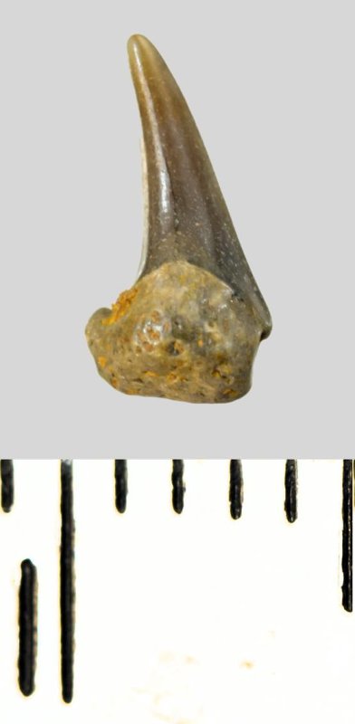 Зуб (фрагмент). Акула. Eostriatolamia subulata (Agassiz, 1843). Классификация: Хордовые Chordata, Позвоночные Vertebrata, Хрящевые рыбы Chondrichthyes, Пластиножаберные Elasmobranchii, Акулы Selachii, Ламнообразные Lamniformes, Песчаные акулы Odontaspididae