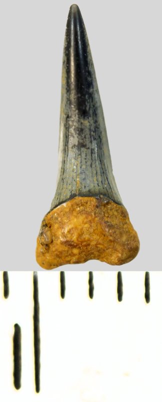 Зуб (фрагмент). Акула. Eostriatolamia subulata (Agassiz, 1843). Классификация: Хордовые Chordata, Позвоночные Vertebrata, Хрящевые рыбы Chondrichthyes, Пластиножаберные Elasmobranchii, Акулы Selachii, Ламнообразные Lamniformes, Песчаные акулы Odontaspididae