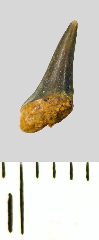 Коронка мелкого бокового зуба серого цвета, колюще-режущего типа, S-образно изогнутая, с гладким режущим краем. С лингвальной стороны у основания коронки на эмали имеется скульптура в виде слабой продольной струйчатости. Корень охристый, сохранился фрагментарно
