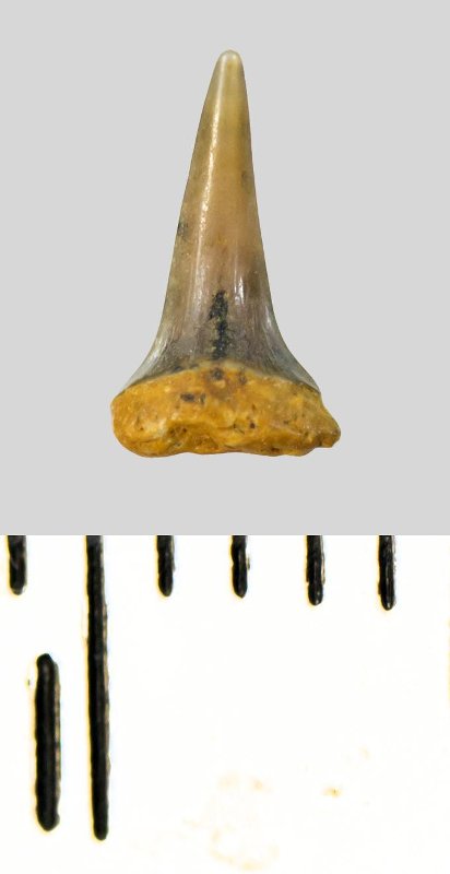 Зуб (фрагмент). Акула. Eostriatolamia subulata (Agassiz, 1843). Классификация: Хордовые Chordata, Позвоночные Vertebrata, Хрящевые рыбы Chondrichthyes, Пластиножаберные Elasmobranchii, Акулы Selachii, Ламнообразные Lamniformes, Песчаные акулы Odontaspididae