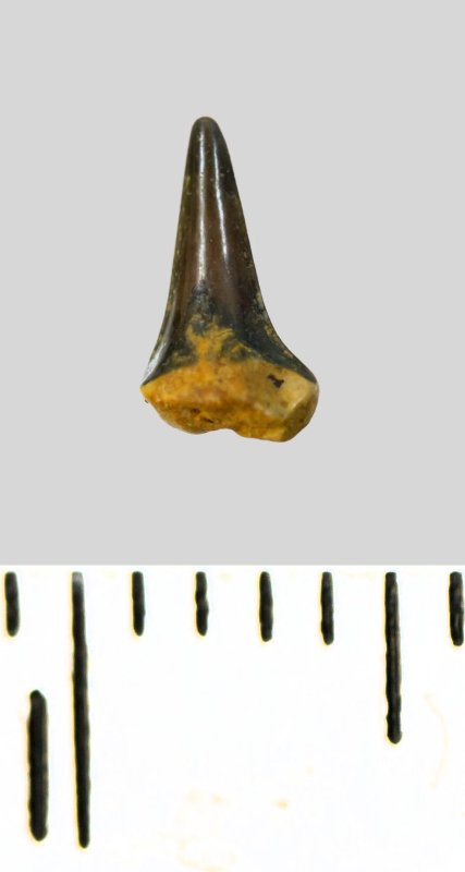 Зуб (фрагмент). Акула. Eostriatolamia subulata (Agassiz, 1843). Классификация: Хордовые Chordata, Позвоночные Vertebrata, Хрящевые рыбы Chondrichthyes, Пластиножаберные Elasmobranchii, Акулы Selachii, Ламнообразные Lamniformes, Песчаные акулы Odontaspididae
