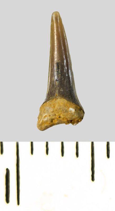 Зуб (фрагмент). Акула. Eostriatolamia subulata (Agassiz, 1843). Классификация: Хордовые Chordata, Позвоночные Vertebrata, Хрящевые рыбы Chondrichthyes, Пластиножаберные Elasmobranchii, Акулы Selachii, Ламнообразные Lamniformes, Песчаные акулы Odontaspididae