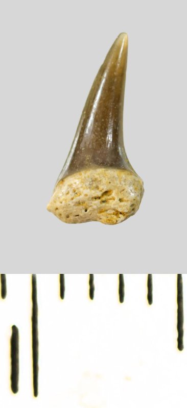 Зуб (фрагмент). Акула. Eostriatolamia subulata (Agassiz, 1843). Классификация: Хордовые Chordata, Позвоночные Vertebrata, Хрящевые рыбы Chondrichthyes, Пластиножаберные Elasmobranchii, Акулы Selachii, Ламнообразные Lamniformes, Песчаные акулы Odontaspididae
