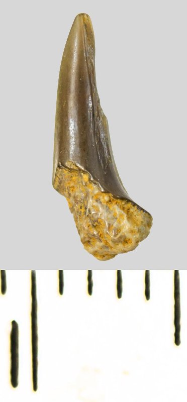 Коронка мелкого бокового зуба серого цвета, колюще-режущего типа, S-образно изогнутая, с гладким режущим краем. С лингвальной стороны у основания коронки на эмали имеется скульптура в виде слабой продольной струйчатости. Корень охристый, сохранился фрагментарно