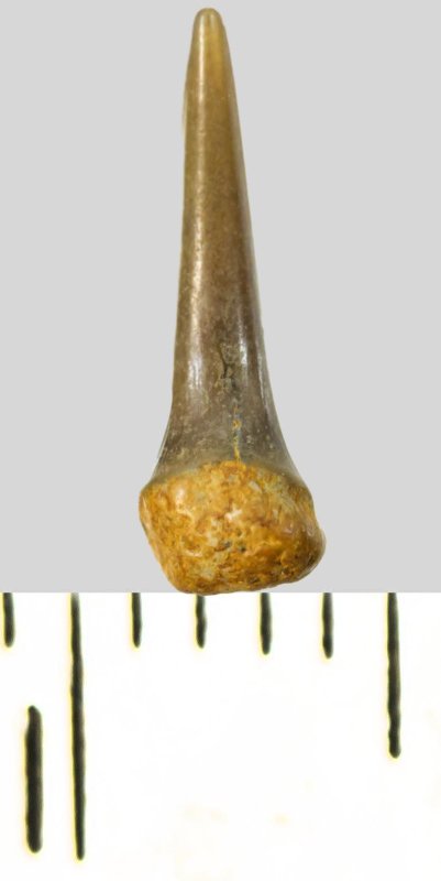 Коронка мелкого бокового зуба серого цвета, колюще-режущего типа, S-образно изогнутая, с гладким режущим краем. С лингвальной стороны у основания коронки на эмали имеется скульптура в виде слабой продольной струйчатости. Корень охристый, сохранился фрагментарно