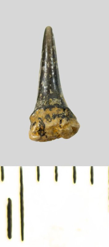 Коронка мелкого бокового зуба серого цвета, колюще-режущего типа, S-образно изогнутая, с гладким режущим краем. С лингвальной стороны у основания коронки на эмали имеется скульптура в виде слабой продольной струйчатости. Корень охристый, сохранился фрагментарно