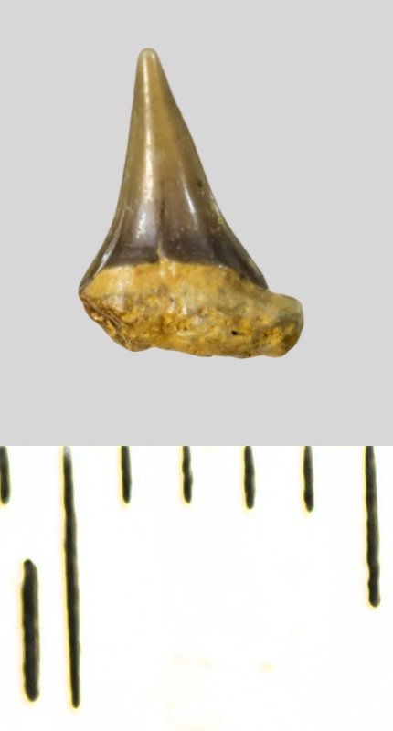 Зуб (фрагмент). Акула. Eostriatolamia subulata (Agassiz, 1843). Классификация: Хордовые Chordata, Позвоночные Vertebrata, Хрящевые рыбы Chondrichthyes, Пластиножаберные Elasmobranchii, Акулы Selachii, Ламнообразные Lamniformes, Песчаные акулы Odontaspididae