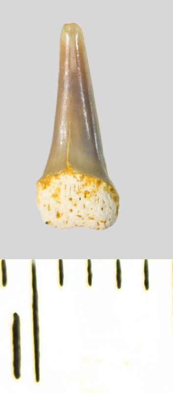 Зуб (фрагмент). Акула. Eostriatolamia subulata (Agassiz, 1843). Классификация: Хордовые Chordata, Позвоночные Vertebrata, Хрящевые рыбы Chondrichthyes, Пластиножаберные Elasmobranchii, Акулы Selachii, Ламнообразные Lamniformes, Песчаные акулы Odontaspididae