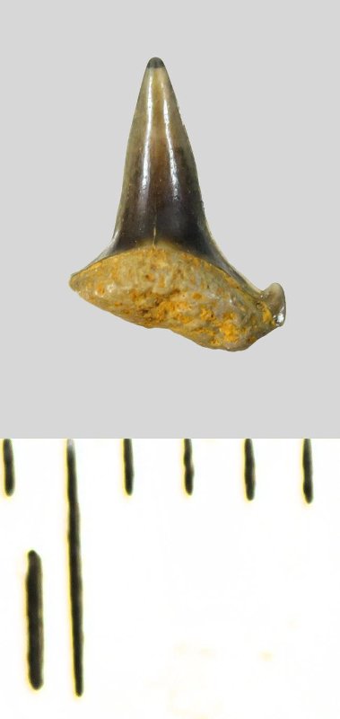 Зуб (фрагмент). Акула. Eostriatolamia subulata (Agassiz, 1843). Классификация: Хордовые Chordata, Позвоночные Vertebrata, Хрящевые рыбы Chondrichthyes, Пластиножаберные Elasmobranchii, Акулы Selachii, Ламнообразные Lamniformes, Песчаные акулы Odontaspididae