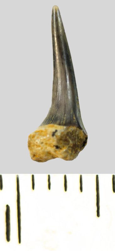 Зуб (фрагмент). Акула. Eostriatolamia subulata (Agassiz, 1843). Классификация: Хордовые Chordata, Позвоночные Vertebrata, Хрящевые рыбы Chondrichthyes, Пластиножаберные Elasmobranchii, Акулы Selachii, Ламнообразные Lamniformes, Песчаные акулы Odontaspididae