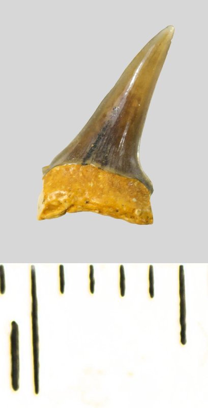 Зуб (фрагмент). Акула. Eostriatolamia subulata (Agassiz, 1843). Классификация: Хордовые Chordata, Позвоночные Vertebrata, Хрящевые рыбы Chondrichthyes, Пластиножаберные Elasmobranchii, Акулы Selachii, Ламнообразные Lamniformes, Песчаные акулы Odontaspididae
