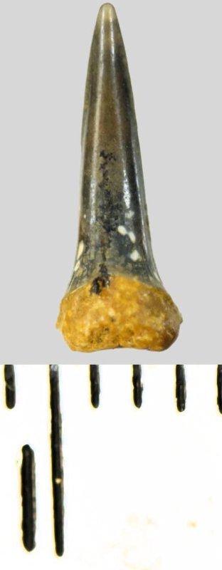 Зуб (фрагмент). Акула. Eostriatolamia subulata (Agassiz, 1843). Классификация: Хордовые Chordata, Позвоночные Vertebrata, Хрящевые рыбы Chondrichthyes, Пластиножаберные Elasmobranchii, Акулы Selachii, Ламнообразные Lamniformes, Песчаные акулы Odontaspididae