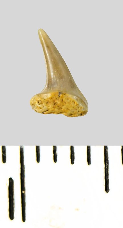 Зуб (фрагмент). Акула. Eostriatolamia subulata (Agassiz, 1843). Классификация: Хордовые Chordata, Позвоночные Vertebrata, Хрящевые рыбы Chondrichthyes, Пластиножаберные Elasmobranchii, Акулы Selachii, Ламнообразные Lamniformes, Песчаные акулы Odontaspididae