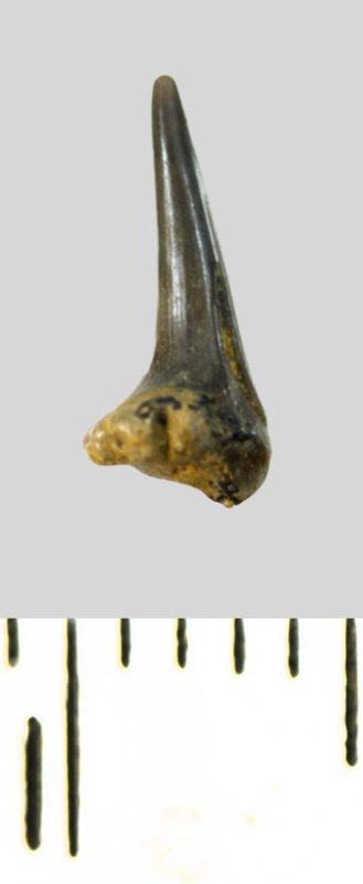 Зуб (фрагмент). Акула. Eostriatolamia subulata (Agassiz, 1843). Классификация: Хордовые Chordata, Позвоночные Vertebrata, Хрящевые рыбы Chondrichthyes, Пластиножаберные Elasmobranchii, Акулы Selachii, Ламнообразные Lamniformes, Песчаные акулы Odontaspididae