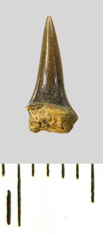 Зуб (фрагмент). Акула. Eostriatolamia subulata (Agassiz, 1843). Классификация: Хордовые Chordata, Позвоночные Vertebrata, Хрящевые рыбы Chondrichthyes, Пластиножаберные Elasmobranchii, Акулы Selachii, Ламнообразные Lamniformes, Песчаные акулы Odontaspididae
