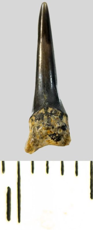 Зуб (фрагмент). Акула. Eostriatolamia subulata (Agassiz, 1843). Классификация: Хордовые Chordata, Позвоночные Vertebrata, Хрящевые рыбы Chondrichthyes, Пластиножаберные Elasmobranchii, Акулы Selachii, Ламнообразные Lamniformes, Песчаные акулы Odontaspididae