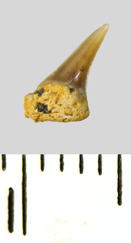 Зуб (фрагмент). Акула. Eostriatolamia subulata (Agassiz, 1843). Классификация: Хордовые Chordata, Позвоночные Vertebrata, Хрящевые рыбы Chondrichthyes, Пластиножаберные Elasmobranchii, Акулы Selachii, Ламнообразные Lamniformes, Песчаные акулы Odontaspididae