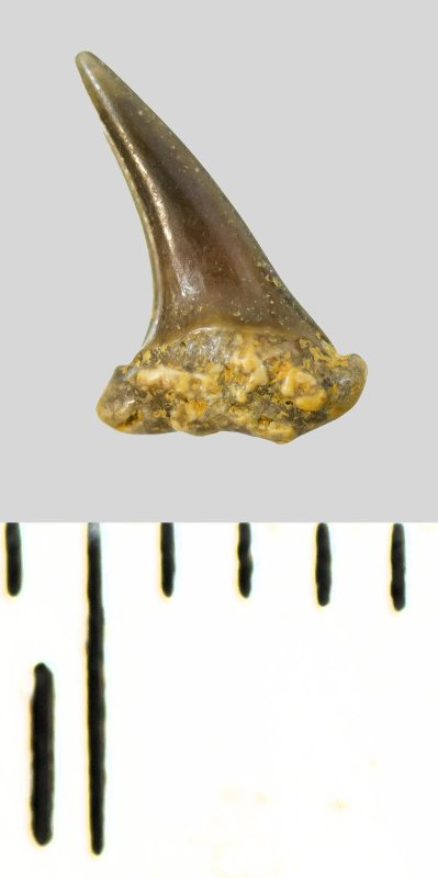 Зуб (фрагмент). Акула. Eostriatolamia subulata (Agassiz, 1843). Классификация: Хордовые Chordata, Позвоночные Vertebrata, Хрящевые рыбы Chondrichthyes, Пластиножаберные Elasmobranchii, Акулы Selachii, Ламнообразные Lamniformes, Песчаные акулы Odontaspididae