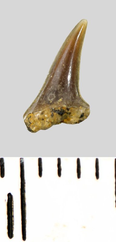 Зуб (фрагмент). Акула. Eostriatolamia subulata (Agassiz, 1843). Классификация: Хордовые Chordata, Позвоночные Vertebrata, Хрящевые рыбы Chondrichthyes, Пластиножаберные Elasmobranchii, Акулы Selachii, Ламнообразные Lamniformes, Песчаные акулы Odontaspididae