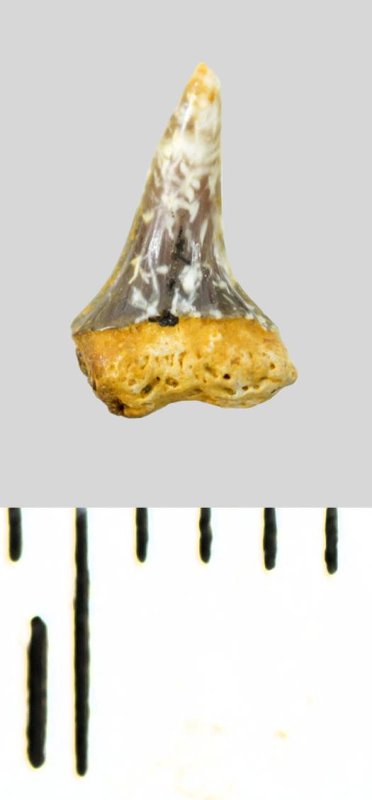 Зуб (фрагмент). Акула. Eostriatolamia subulata (Agassiz, 1843). Классификация: Хордовые Chordata, Позвоночные Vertebrata, Хрящевые рыбы Chondrichthyes, Пластиножаберные Elasmobranchii, Акулы Selachii, Ламнообразные Lamniformes, Песчаные акулы Odontaspididae