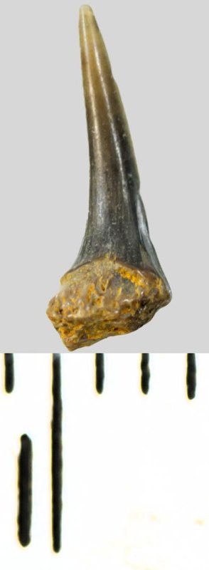 Зуб (фрагмент). Акула. Eostriatolamia subulata (Agassiz, 1843). Классификация: Хордовые Chordata, Позвоночные Vertebrata, Хрящевые рыбы Chondrichthyes, Пластиножаберные Elasmobranchii, Акулы Selachii, Ламнообразные Lamniformes, Песчаные акулы Odontaspididae