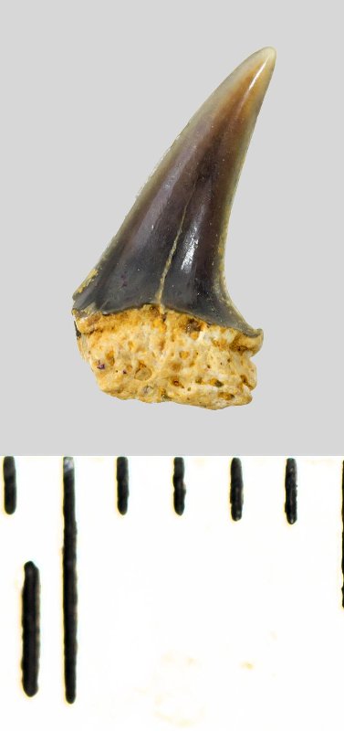 Зуб (фрагмент). Акула. Eostriatolamia subulata (Agassiz, 1843). Классификация: Хордовые Chordata, Позвоночные Vertebrata, Хрящевые рыбы Chondrichthyes, Пластиножаберные Elasmobranchii, Акулы Selachii, Ламнообразные Lamniformes, Песчаные акулы Odontaspididae